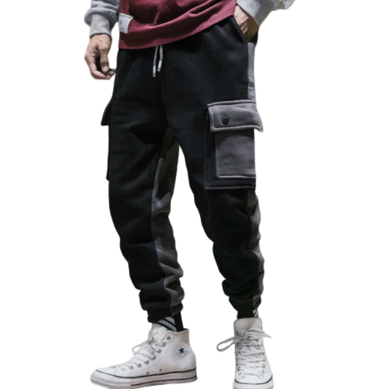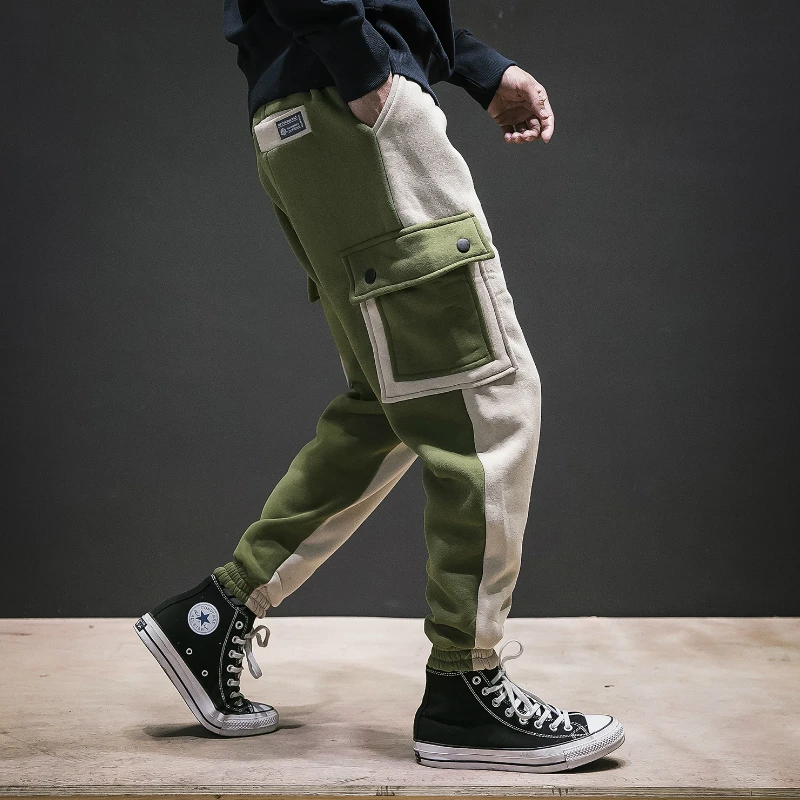 HIGH QUALITY Men Casual Pants 2019 Autumn Winter New Plus Velvet Personality Stitching Color Suits with Big Pock
